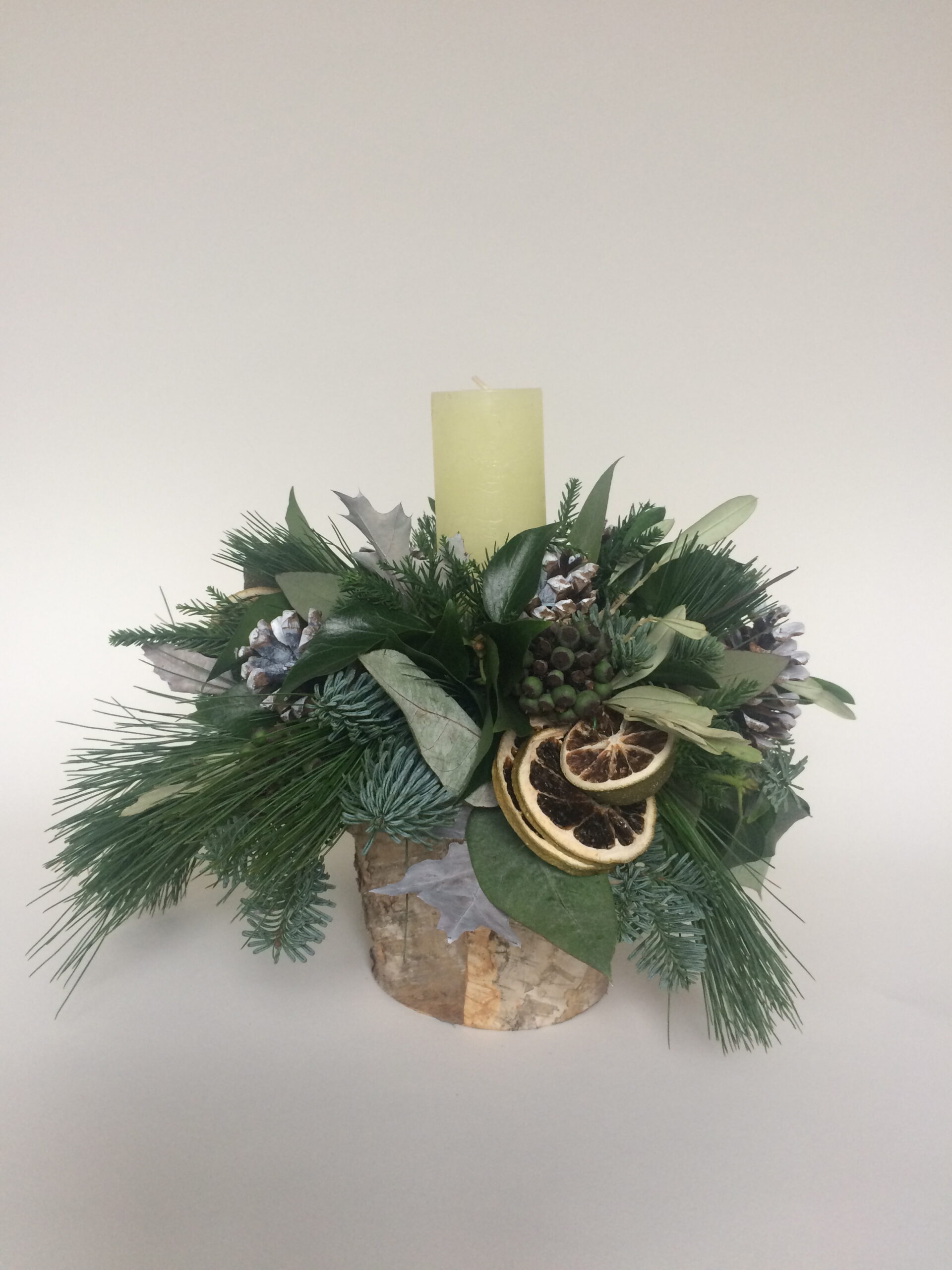 A round candle arrangement with seasonal foliage, cones, dried fruit and a matching candle.